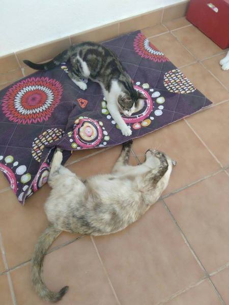 supimos de su situación y la recogimos de la calle preñada. Desde entonces vive con nosotras, es una gata con una personalidad increíble, todos los gatos con los que convive la quieren y la respetan,